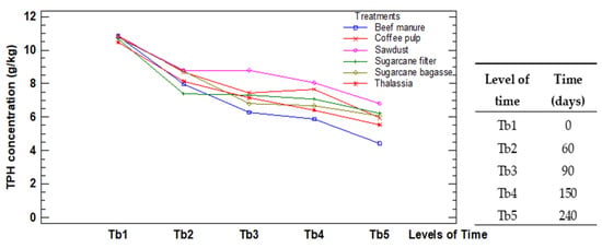 In test B, in all treatments, the TPH concentration decreased until 240 days, with removal percentages between 40% and 60%, values similar to the ones achieved by other authors [,,]. The treatments order rank was B5, B6, B2, B1, B4, B3. Specifically, Treatment B5 (beef manure) was the one that reported the lowest TPH concentrations at 240 days, keeping this trend after 60 days. The means obtained for B5 presented marked statistical differences with the rest of the treatment, being the one with the mean lower limit interval under 7.0 g·kg−1. In contrast, B3 (sawdust) presented the worst TPH removal, keeping this trend after the 60 days, being the only treatment with the mean interval over 8.0 g·kg−1. Despite the rank order, the TPH means of B6, B2 and B1 do not present significative differences for a 95% confidence level. Furthermore, the differences between the levels in the factor Time evidence the evolution in the degradation process.