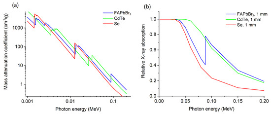 (a) Mass attenuation coefficient calculated using NIST XCOM for FAPbBr, CdTe and Se, (b) Calculated relative X-ray absorption, expressed as the fraction of incident X-ray photons absorbed by a 1 mm thick detector, for FAPbBr, CdTe and Se.
