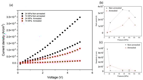 (a) Dark current density of the pellets as a function of pressure before and after annealing process. (b) The dark current, measured at 5 V, as a function of pressure, both with and without pellet annealing. (c) The resistivity variation with different pressures before and after annealing.