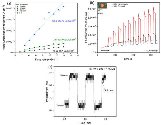 (a) Photocurrent vs. dose rate response for devices formed with various pressures. (b) Comparison of X-ray photocurrent response of non-annealed and annealed FAPbBr pellets formed at a pressure of 12 MPa. (c) Time response to X-rays using a mechanical X-ray chopper for the FAPbBr device formed at 75 MPa.