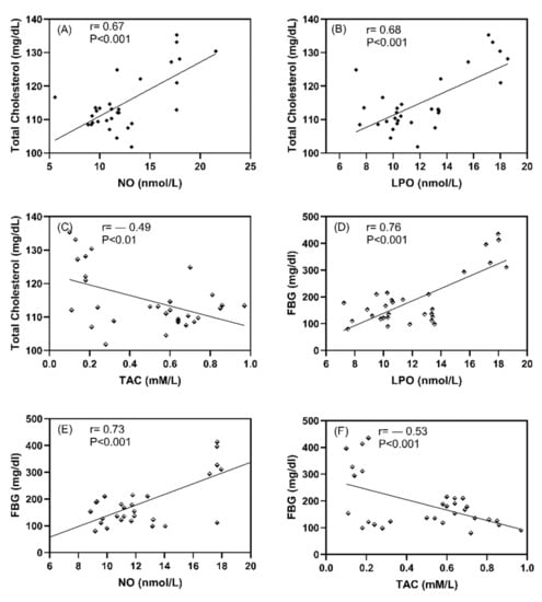 3.6. The Association between Oxidative Stress Markers and FBG and Cholesterol Levels