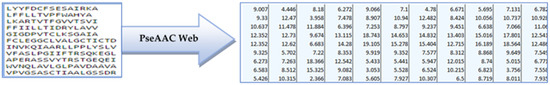 Feature extraction is used in the proposed framework to convert sequences to numerical attributes, as shown in Figure 2. The peptides are converted to digital vector using PseAAC server for the computational process [20,35], where the peptide features are extracted from conventional AAC with six physicochemical properties with weight factor (0.05) and lambda given the value of 2, where the 6 physicochemical properties are: Hydrophobicity, Hydrophilicity, pK1 (Ca–COOH), pK2 (NH3), PI (25 _C), and molecular weight. The 63 combinations of physicochemical properties are considered, and 126 features are extracted (λ = 2) from the peptide dataset for sequence order information [36]. These features are generated from type 1 of the PseAAC web server (http://www.csbio.sjtu.edu.cn/bioinf/PseAAC, accessed on 10 January 2022).