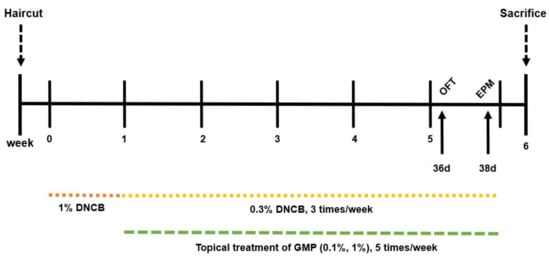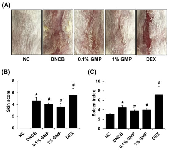 BALB/c (three-week-old, male) mice were obtained from Koatech (Seoul, Korea). Male mice were used in this study because the individual estrous cycle in the female mice might result in more variable data than male mice. Moreover, female hormones (estrogen, progesterone) have been reported to promote Th2 activity that affects clinical outcomes in the AD model []. Animal studies were conducted according to the protocols approved by the Institutional Animal Care and Use Committee of Dongguk University (IACUC-2020-05). The animals were stabilized for two weeks before the experiments. The mice were divided randomly to five groups (n = 7–8 per group): normal control group (NC), DNCB treatment group (DNCB), DNCB plus 0.1% of GMP (0.1% GMP), DNCB plus 1% of GMP (1% GMP), DNCB plus 0.1% DEX (DEX). Figure 1 shows a schematic diagram of the experimental schedule. BALB/c mice were treated topically with 4% SDS and 1% DNCB three times per week for one week (sensitization period). The AD-like skin lesions were maintained by topical treatment with 0.3% DNCB three times per week for five weeks. DNCB, GMP, and DEX were dissolved in a 3:1 mixture of acetone and olive oil. The mice were treated topically with vehicles or drugs (200 μL) five times per week for five weeks. The severity of skin lesions was assessed for symptoms of erythema, edema, scale/dryness, and abrasions in the epidermis. The scale for each symptom includes the following: 0 (asymptomatic), 1 (mild), 2 (moderate), and 3 (severe). At the end of the experiment, all mice were sacrificed using isoflurane, and the body weight and spleen weight of each mouse was recorded. The spleen index was defined as the ratio of spleen weight to body weight (mg/g). For protein expression analysis, skin lesions on the back and prefrontal cortex (PFC) were excised and homogenized using a tissue extraction reagent.