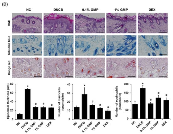 As shown in Figure 2A,B, after applying DNCB to the back skin for six weeks, the clinical skin symptoms of the DNCB group was significantly more severe than the NC group. In contrast, the skin scores were reduced significantly in the 0.1% GMP and 1% GMP treated groups compared to the DNCB group (Figure 2A,B). In addition, the spleen index was reduced significantly in the DNCB group compared to the NC group, which was significantly lower in the GMP-treated groups (Figure 2C). The topical application of GMP decreased DNCB-induced epidermal hyperplasia significantly in BALB/c mice (Figure 2D). Toluidine blue and Congo red staining results showed that eosinophil and mast cell infiltrations in the skin lesions were less severe in the 0.1% GMP and 1% GMP groups than in the DNCB group (Figure 2D).