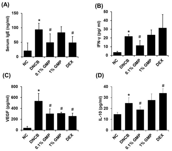 Effect of GMP on serum IgE and inflammatory cytokines. Serum IgE and cytokine levels were evaluated by ELISA. (A) Serum IgE level. (B–D) Levels of inflammatory cytokine IFN-γ, VEGF, and IL-10 in the skin lesions. Data represent the means ± SDs. * p < 0.05 vs. the NC group, # p < 0.05 vs. the DNCB group.