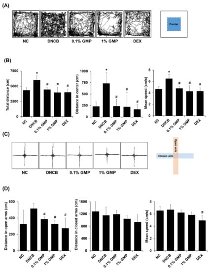 Effect of GMP on behavioral changes in DNCB-treated BALB/c mice. (A) Representative tracking images of each group in the OFT. (B) Total distance, distance in center, and mean speed in the OFT were assessed on day 36. (C) Representative tracking images of each group in the EPM. (D) Distance in open arms, closed arms, and mean speed in the EPM were assessed on day 38. Data represent the means ± SDs. * p < 0.05 vs. the NC group, # p < 0.05 vs. the DNCB group.