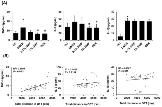 Effect of GMP on the inflammatory cytokine levels in the PFC in DNCB-treated BALB/c mice. (A) Inflammatory cytokines TNF-α, IL-6, and IL-1β levels in the PFC area of the brain. (B) Correlation between inflammation cytokine and total distance in OFT. Data represent the means ± SDs. * p < 0.05 vs. the NC group, # p < 0.05 vs. the DNCB group.