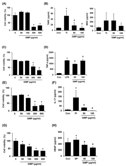 Effect of GMP on the inflammatory responses in vitro. (A) Effect of GMP on cell viability of HaCaT cells. (B) Effect of GMP on TARC and MDC production in TI-stimulated HaCaT cells. (C) Effect of GMP on cell viability of Raw264.7 cells. (D) Effect of GMP on TNF-α level in LPS-stimulated Raw264.7 cells. (E) Effect of GMP on cell viability of EL4 cells. (F) Effect of GMP on IL-17 level in PI-stimulated EL4 cells. (G) Effect of GMP on cell viability of HMC-1 cells. (H) Effect of GMP on VEGF production in SP-stimulated HMC-1 cells. Data represent the means ± SDs. * p < 0.05 vs. the Con, # p < 0.05 vs. the TI-treated cells, # p < 0.05 vs. the LPS-treated cells, # p < 0.05 vs. the PI-treated cells. # p < 0.05 vs. the SP-treated cells.