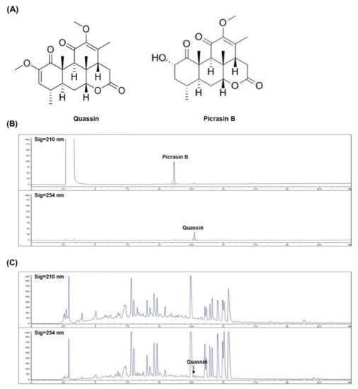 The bioactive compounds in GMP were quassin and picrasin B (Figure 7A) []. Figure 7B presents chromatograms of two standard compounds. Quassin, but not picrasin B, was detected in the GMP extract (Figure 7C). The retention time of quassin was 12.733 min, and the concentration of quassin in GMP was 2.963 mg/g.