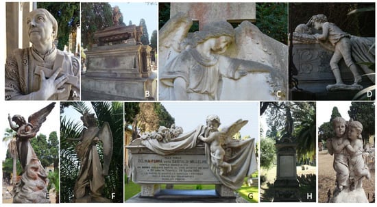 The sampled Carrara marble funerary monuments of the ancient monumental cemetery of Bonaria—Cagliari entitled to (A) Avv. Giuseppe Todde; (B) Antonio Viganigo; (C) A. M. Frau Carta; (D) Francesca Warzee; (E) Rossino Bolla spouse; (F) Giuseppina Ara dei conti Ciarella; (G) Zelina Ferrà Gastaldi Millelire; (H) Ignazio Ruda Roych conte di San Lorenzo; (I) Unknown Burial.