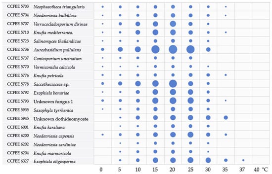 All the tested strains were able to grow within the range of 5–25 °C (Figure 2, Table S1); the majority can grow at 0 °C (13/18), less than a half (7/18) at 35 °C; only E. oligosperma CCFEE 6327 at 37 °C, and none at 40 °C. Most of the strains grew best at 20 °C, except K. petricola CCFEEE 5776, N. capensis CCFEE 6200, and E. oligosperma CCFEE 6327 having an optimum at 25 °C.