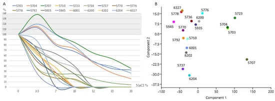 Salt tolerance tests results. (A) The measures taken after one-month incubation at 20 °C are calculated as a percentage compared to the control plate (0% NaCl). (B) The PCA plot evidenced in the right side of the separated group of halophilic strains, and others (from right to left side) ordered according to their salt tolerance.
