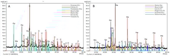 Similar XRD diffraction patterns were recorded in the two deteriorated marbles affected by granular disintegration and crumbling (namely Antonio Viganigo, AV; and Ruda Roych, RR-data not shown). Significative differences were instead evidenced when the diffraction pattern of the AV deteriorated and soluble salt affected marble (Figure 4B) was compared to a gypsum film from an old compact marble monument (Ferrà Gastaldi Millelire; FGM, Figure 4A). Soluble salts and other decay phases were found in different amounts. In the grey film of FGM monument gypsum (CaSO4·2H2O) and calcite (CaCO3) prevailing on whewellite (CaC2O4·H2O), quartz (SiO2), halite (NaCl), sylvine (KCl) and titanite (CaTiSiO5). On a more weathered monument (AV), affected by granular disintegration and crumbling, the whitish crust shows mineralogical phases related to natural pollution (marine and soil particles) as halite, quartz, albitic plagioclase, as well gypsum and calcite.