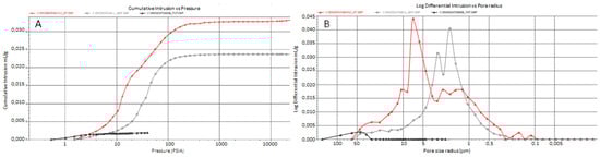MIP porosity results. MIP porosity of an unaffected-new “Statuarietto” marble (black), a decohesed (gray, AV), and highly decohesed marble (red, RR). (A) Cumulative Hg intrusion vs. pressure and (B) Log. differential intrusion vs. pore size distribution.