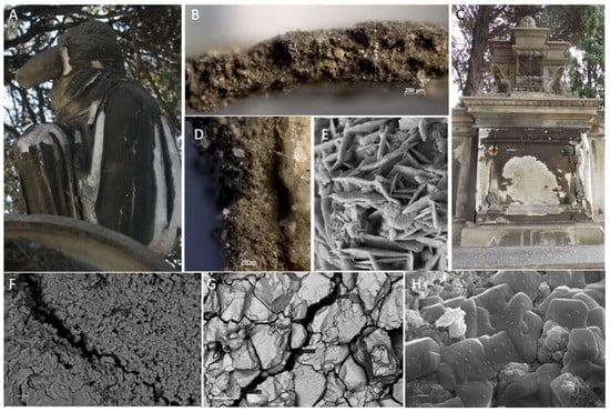 Granular disintegration marble: a salty niche. Particular to the monuments affected by granular disintegration into sand and powder devoted to (A) Ruda Roych (RR) and (C) Antonio Viganigo (AV). (B,D) Dark sulfation crust of AV monument by light reflection optical microscopy: (C) cross section, (D) surface and fracture on dark crust and salt crystals (NaCl) deposition. (E–H) RR sample SEM observation. (E) gypsum crystals; (F,G) granular disintegration, (H) salt crystals (NaCl) on marble surface. The bar corresponds to 10 μm in (F), 200 μm in (G); and 2 μm in (H).