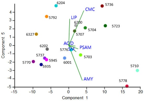 PCA analysis performed on halos occurred after metabolic assays evidenced in the right side the most responsive strains (Figure 7). All the halophilic strains take place within the most responsive strains. Interestingly K. mediterranea CCFEE 5710, due to the intense halos recorded, occupied quite a far position in respect to the other Knufia species in the study (namely K. petricola CCFEE 5776, K. karalitana CCFEE 6001, and K. marmoricola CCFEE 6204).