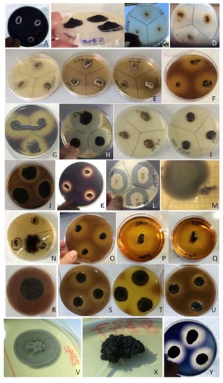Moreover, during metabolic screenings it was possible to collect additional information such as the loss of melanization by the dothidealean fungi (namely A. pullulans CCFEE 5736 and Saccotheciaceae sp. CCFEE 5778) when grown in SM (Figure 8L), the volcano-like growth showed by K. mediterranea CCFEE 5710 in presence of high concentration of glucose (Figure 8B), and the inhibitory action of K. marmoricola and K. petricola against a cladosporiacean plate contaminant (Figure 8M,N, respectively).