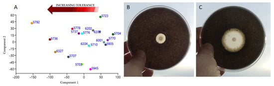 Results of sensitiveness to traditional biocides. (A) PCA plot based on the ADT halos recorded using four different biocides at all the tested doses; from the left to the right there is an increasing sensitiveness, in the opposite sense an increasing tolerance to biocides. (B,C) ADT performed on E. oligosperma CCFEE 6327: (B) sharp inhibition halo obtained using BZC 3%, (C) double halo obtained when BioR 4% was used. There are notable zones of total (next to the disc), and partial inhibition (external) where growth is slowed.