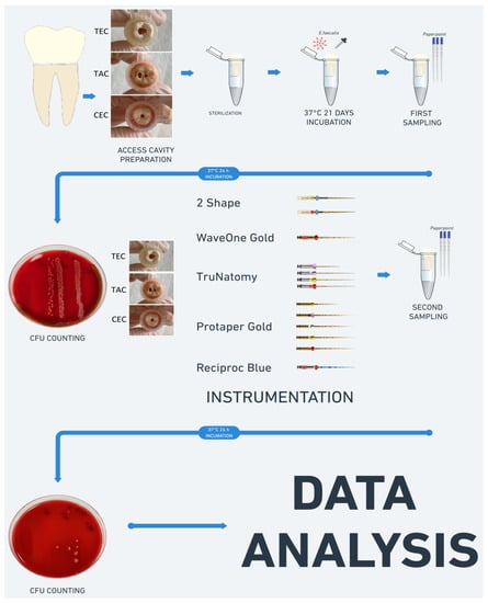 Bacterial samples were taken prior to (S1) and following instrumentation (S2) from the root canals. Each root canal was initially rinsed using 1 mL of 0.85% sterile saline solution. Subsequently, a sterile #20 K-file was inserted into the canals and the canal walls were slightly touched with an in-and-out motion circumferentially to remove intact bacterial cells. Initial samples (S1) were obtained from the root canals by inserting three pieces of #15 sterile paper point for one minute. The paper points were transferred to an Eppendorf tube with 1 mL of 0.85% phosphate-buffered solution and were vortexed for one minute. For quantitative bacterial assessment, 10-fold serial dilutions were prepared, and every dilution was plated on a BHI agar medium and incubated at 37 °C for 24 h. CFU counting was performed, and counts were converted into CFU/mL based on the dilution factor.