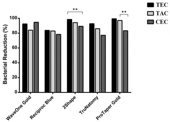 When the effectiveness of the mechanical preparations in reducing bacterial load in the TEC groups was evaluated, a significantly greater bacterial reduction was observed in the TEC-ProTaper Gold group than in the TEC-Reciproc Blue, TEC-WaveOne Gold, and TEC-TruNatomy groups. In addition, the TEC-2Shape group exhibited greater bacterial reduction compared to the TEC-Reciproc Blue (p ˂ 0.05) group. In the CEC groups, differences between the tested file systems were not significant (p > 0.05). In the TAC groups, bacterial reduction was significantly greater in the TAC-ProTaper Gold group in comparison to the TAC-WaveOne Gold and TAC-Reciproc Blue groups.