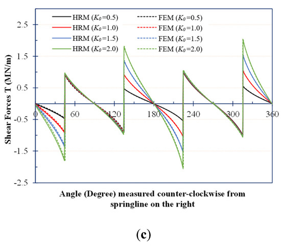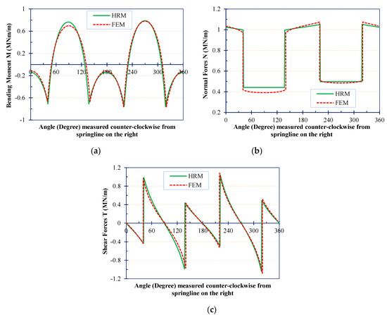 Figure 6 and Table 2 show the comparative results in the case of the rectangular tunnel. The maximum bending moment Mmax and the minimum bending moment Mmin obtained in the HRM method are 0.85% and 1.33% different from the corresponding values of FEM. In the HRM method, the maximum normal force Nmax and minimum normal force Nmin are 1.95% and 12.74%, respectively, smaller than those of the FEM model. The differences of maximum shear force Tmax and minimum normal shear force Tmin between the HRM method and FEM are both 2.93%.