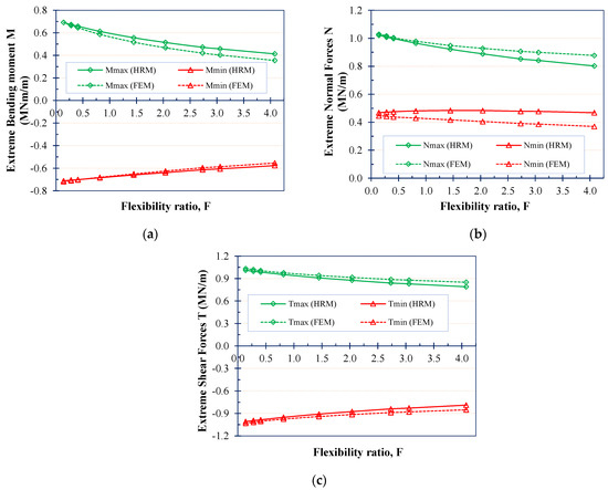 Effect of flexibility ratios F on internal forces in the square tunnel: (a) Extreme bending moments M; (b) Extreme normal forces N; (c) Extreme shear forces T.