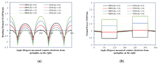 - The change in the K0 value mainly causes the variation of normal forces at the top and bottom parts of the lining. Its influence on the normal forces at the tunnel sidewalls is negligible. An increase in the K0 value causes a corresponding increase in the normal forces at the top and bottom of the lining (see Figure 8b). It is related to the larger lateral active load applied from the surrounding ground on the sidewall and then transferring to the top and bottom lining parts when the K0 value increases. Generally, the greater the K0 value, the higher the maximum normal forces induced in the tunnel lining (see Figure 9b);
