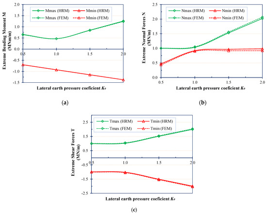 Effect of K0 on the internal forces in the squared tunnel lining: (a) Extreme bending moments M; (b) Extreme normal forces N; (c) Extreme shear forces T.