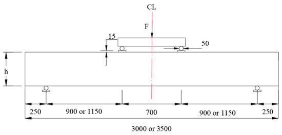 Slabs that are 3000 and 3500 mm long were supported over spans of 2500 and 3000 mm, respectively. Two concentrated loads were placed symmetrically on the slabs 700 mm apart (Figure 3). A 10 mm thick soleplate designed to prevent bearing failure was installed at the point of contact between the specimen and the roller support.