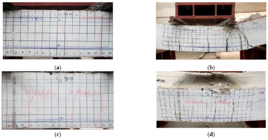 SA-H16-PR-2 specimen (a) with the 1st 0.3 mm crack, (b) after the failure of the slab, and SH-H19-PR-2 specimen (c) with the 1st 0.3 mm crack, (d) after the failure of the slab.