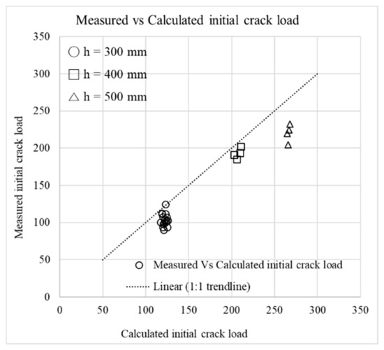 Initial cracking load values are obtained using Equation (2) and measured during testing of the slabs. As shown in Figure 5, the initial cracking load values for slabs with a thickness of 300 and 400 mm are closer to the calculated values, whereas for slabs with a thickness of 500 mm, the measured values are lower than the calculated values, which indicates that cracking occurred early in the case with 500 mm slab specimens.