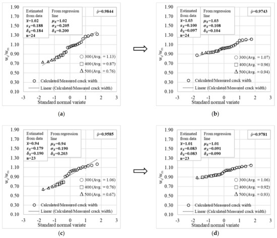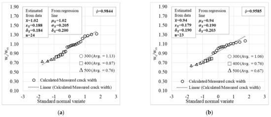 Probabilistic models of all basic design variables are presented in Table 8 and were selected based on studies from Kim et al. [15] except the probabilistic model of rebar spacing biasness (). A probabilistic model for rebar spacing biasness is developed from the information collected from various construction sites of underground RC box culverts in Korea. Probabilistic models of crack width biasness are summarized in Table 10, in which the means and covariances are estimated from the cumulative density function of the calculated-to-measured crack width ratios summarized in Figure 12.