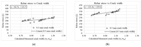 Rebar stress and calculated-to-measured crack width ratios for (a) 0.3 mm and (b) 0.5 mm crack widths (Equation (1)).