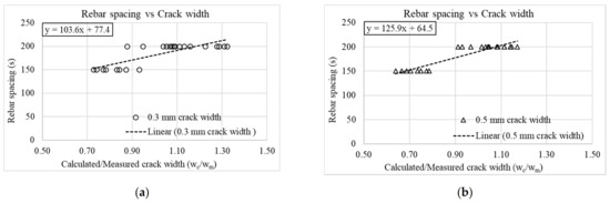 Rebar spacing and calculated-to-measured crack width ratios for (a) 0.3 mm and (b) 0.5 mm crack widths (Equation (1)).