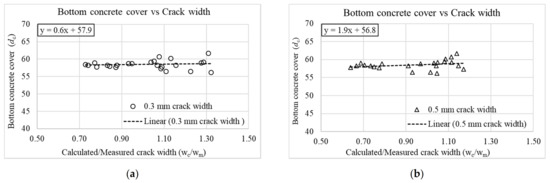 Bottom concrete cover and calculated-to-measured crack width ratios for (a) 0.3 mm and (b) 0.5 mm crack widths (Equation (1)).