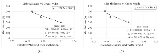 Slab thickness and calculated-to-measured crack width ratios for (a) 0.3 mm and (b) 0.5 mm crack widths (Equation (1)).