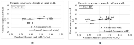 Concrete compressive strength and calculated-to-measured crack width ratios for (a) 0.3 mm and (b) 0.5 mm crack widths (Equation (1)).