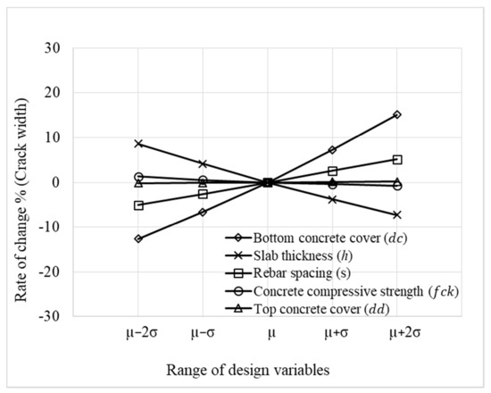 As illustrated in Figure 13, crack widths are most sensitive to the bottom concrete cover (), slab thickness (), and rebar spacing (s), which directly affects the crack width estimations through the suggested model (Equation (3)). The crack width is changed with a rate from −12.65% to 15.15% due to the bottom concrete cover deviation (), and from 8.64% to −7.24% due to the slab thickness deviation (). The crack width changes from −5.08% to 5.17% for rebar spacing (s). For parameters such as the compressive strength of concrete, and top concrete cover, the rate of change is between 1.31% and −0.76%, and −0.17% and 0.17%, respectively, with minimal influence on crack widths.