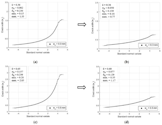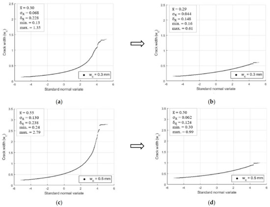 Distribution of simulated crack widths: (a) Original equation (Equation (1)); (b) Modified equation (Equation (3)) for 0.3 mm; (c) Original equation (Equation (1)); (d) Modified equation (Equation (3)) for 0.5 mm crack widths at the negative moment region of the top slab (first major crack).
