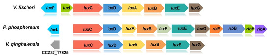Compared to the luminescence (lux) genes among the three strains, one significant difference is the genes upstream of the core light genes (luxCDABEG) (Figure 1). The upstream gene in the opposite direction of Vibrio fischeri is luxR, which forms the luxI/luxR regulatory system with luxI (Table 1). The LuxI/LuxR system mainly regulates the lux operon (luxCDABEG) expression, which contains the genes necessary for light production in V. fischeri. Compared with V. fischeri, the regulatory mechanisms of bioluminescence are not well clarified in P. phosphoreum and V. qinghaiensis. Instead of luxI and luxR, luxL (also named lumP in P. leiognathi, Table 1) is located upstream of the lux operon and transcribed in the opposite direction in P. phosphoreum. It has been found that lumazine protein encoded by luxL plays a role in light emission processes involved in wavelength and intensity transformation. Its derivatives are direct precursors of riboflavin [17]. Compared with the luminant operon of V. fischeri, V. qinghaiensis sp.-Q67 possessed a gene named CCZ37-17825 located in the opposite direction upstream of luxC, whose function is still unknown [18]. Furthermore, Photobacterium possesses luxF and rib genes absent from the lux operon of Vibrio species. It is believed that luxF encoded non-fluorescent flavin proteins which could bind with the bioluminescence inhibitor myristylated FMN to increase the luminescent intensity indirectly [19]. That may be one reason why P. phosphoreum is the brightest species among all the reported bioluminescent bacteria [20]. The additional rib genes (ribEBHA) are related to the redox process of FMNH2, involved in the transformation and synthesis of riboflavin. Few studies have reported the presence of QS-associated genes in P. phosphoreum, and the relationship between bioluminescence and QS has not been clear in this species until now. Compared with V. fischeri, the luxI gene is missing in strain Q67, which is generally recognized as a crucial gene to encode the autoinducer synthase in V. fischeri.