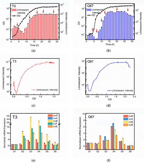 Bioluminescence and lux gene-expression levels of T3 and Q67 throughout the growth phases. (a,b) Growth and bioluminescence kinetics of T3 and Q67. Red arrows represent the sampling times S1 to S6. (c,d) Light emission of T3 and Q67 according to cell density. (e,f) Expression level of the luxDAB(F)E genes in T3 and Q67 for sampling times S1–S6.