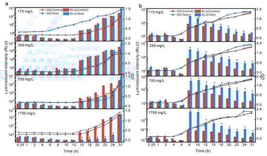 The variation of growth and luminescence level following the addition of crude extract at different concentrations in T3 (a) and Q67 (b). * represents p < 0.05.