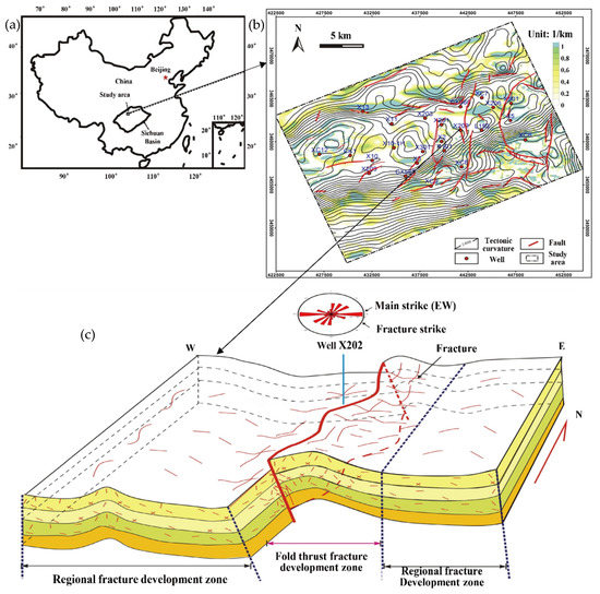 Position, structure and fracture development model of the reservoir in study area. (a) The study area is located in the western Sichuan Basin, China; (b) the top surface structure and structural curvature distribution of the Xu-2 Member reservoir; (c) the fracture development model of the Xu 2 Member reservoir.