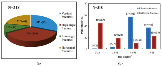 Distribution of structural fractures with different occurrences and their effectiveness for transporting hydrocarbon. (a) Percentage pie chart of the fractures with different occurrences. (b) Percentage histogram of fractures with different dip angles in the effective fractures and the ineffective fractures.