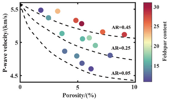 The established rock physics model was used to simulate the variation trend of the P-wave velocity, it shows that the velocity depends on the aspect ratio (AR) of the rock pores, itself depending on the feldspar content. As the dashed lines in Figure 6 show, we found that the scatter was mainly ascribed to the variation of pore structure. Samples with high feldspar content are close to the trends of spherical or tubular pores, while primary matrix pore samples were near the crack-like trend. At a given porosity, the greater the number of secondary dissolution pores, the higher the velocity of the sample.