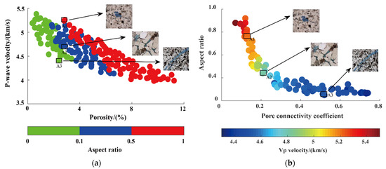 The relationship between pore structure parameters and rock elastic properties. (a) Cross plot between pore aspect ratio and P-wave velocity. (b) Cross plot between pore connectivity coefficient and P-wave velocity.