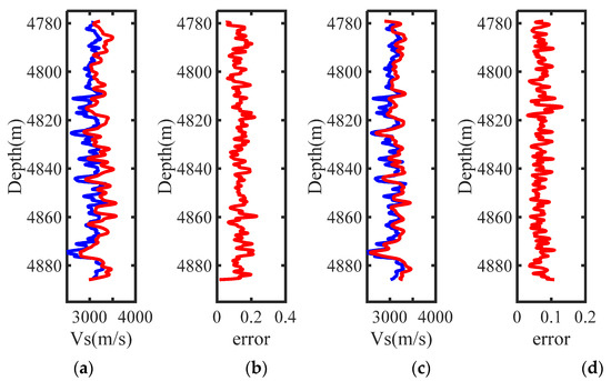 S-wave velocity (Vs) estimated from the rock physics model. (a) Comparison of real velocities (blue) and estimated velocities (red) based on the Xu–White model. (b) The relative error of Vs in (a). (c) Comparison of real velocities (blue) and estimated velocities (red) based on the improved rock physics model. (d) The relative error of Vs in (c).