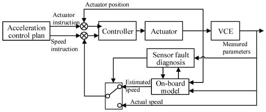 Because of this, this paper presents an acceleration control scheme based on fault tolerance of the sensor for variable cycle engine (VCE), as shown in Figure 1. First, in Section 2, an improved multi-input multi-output adaptive equilibrium manifold model (AEMM) with dual scheduling variables is established. In Section 3, the AEMM is combined with the Kalman filter bank to design the single sensor fault and the double sensor faults diagnosis scheme. Based on this, the actual engine parameter estimation under the sensor fault is obtained. In Section 4, A multi-target method is used to optimize the engine acceleration process control plan to verify the FTC scheme. In Section 5, the above procedure is verified by hardware-in-the-loop simulation, and the FTC of the accelerated process is proved from the perspective of engineering realizability. Section 6 concludes with a summary of the paper.