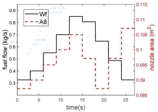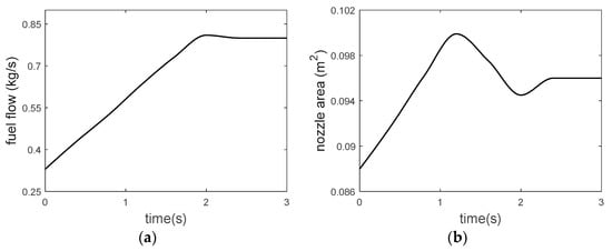 Changing curve of control quantity during acceleration. (a) Fuel flow. (b) Nozzle area.
