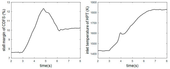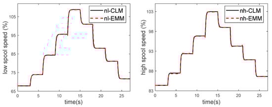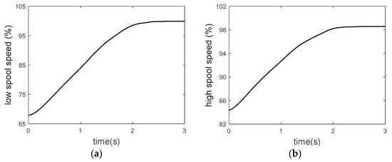It can be seen that the low spool speed changes from 67.87% to 99.9%, and the high spool speed changes from 84.37% to 98.5%. The acceleration time is about 2.4 s. The acceleration process is fast and stable without overshoot, and no overshoot occurs. At the beginning of acceleration, the dominant limiting condition is the rate of change of the control quantity, while at the later stage of acceleration, the dominant limiting condition is and the upper limit of . On the whole, the proposed accelerated process control plan meets the expected objectives.